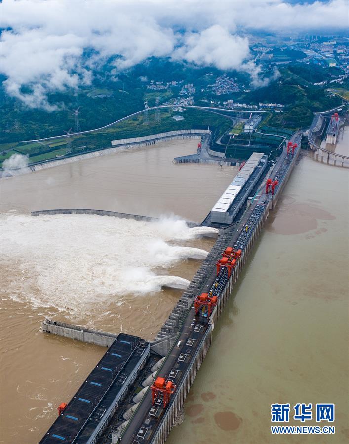 長江三峽樞紐開啟泄洪深孔泄洪(7月2日攝,無人機照片)。新華社發(鄭家裕攝)