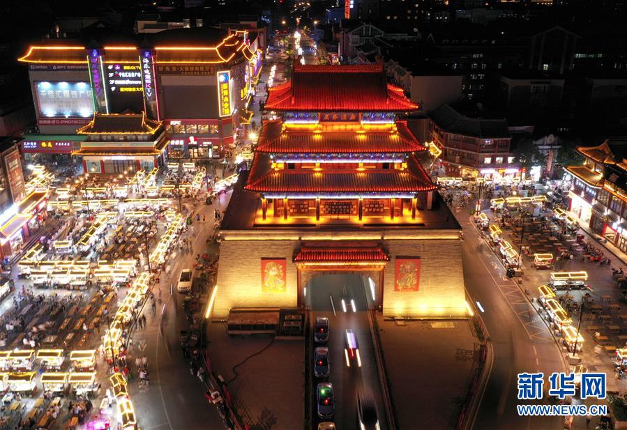 這是6月1日拍攝的河南開封鼓樓夜市(無人機照片)。新華社記者李安攝
