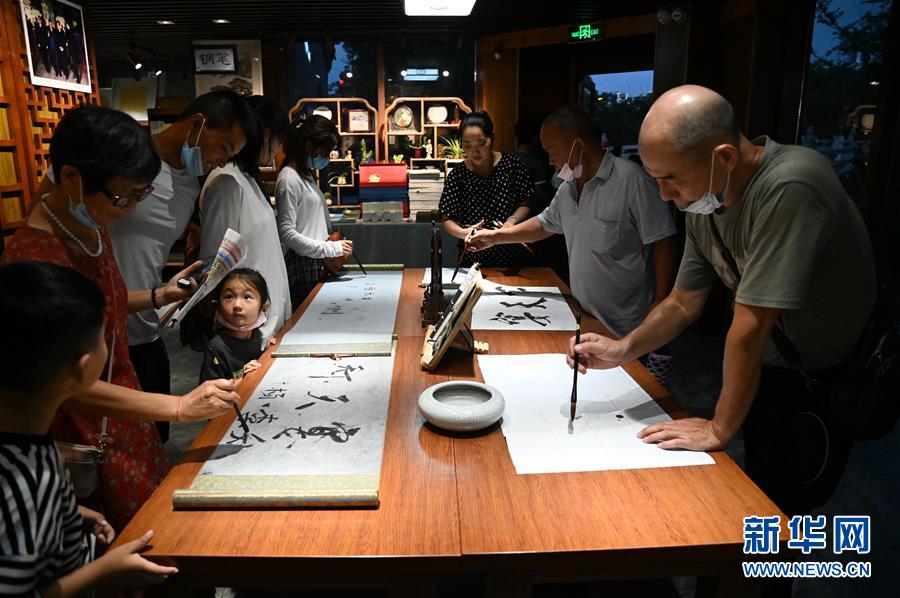 游客在洛陽市洛邑古城的汝陽劉毛筆店內參觀體驗(6月29日攝)。新華社記者張浩然攝