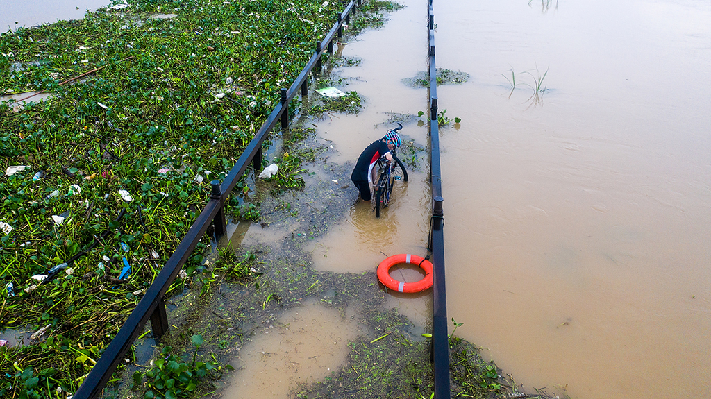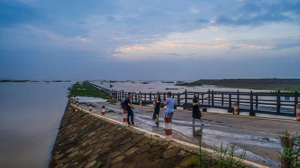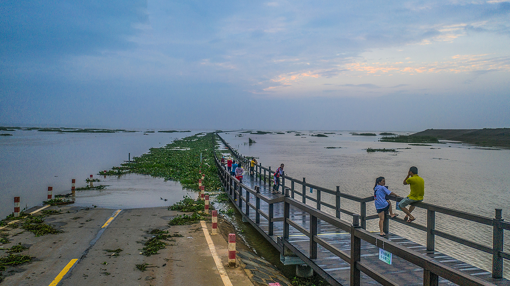 連日來,受連續降雨影響,鄱陽湖水位繼續快速上漲,水體面積不斷擴大,明顯“發福” 的鄱陽湖水體面積今年以來首次突破3000平方公裡。在九江永修境內的永吳公路大湖池段湖水已漸漸淹沒公路路面。馬剛/人民視覺
