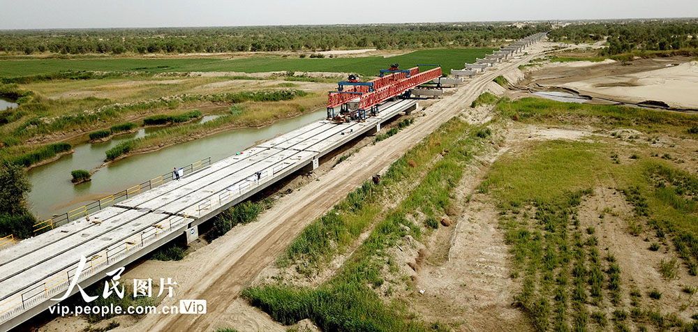 新疆尉犁至且末沙漠公路塔裡木河特大橋日前開始架設。大橋全長1290米,共43孔,預計10月前完成架設。尉犁至且末沙漠公路全長333公裡,其中沙漠路段304公裡,是新疆第三條沙漠公路。公路建成通車后,且末至庫爾勒的路程將縮短280公裡。(陳劍飛/人民圖片)