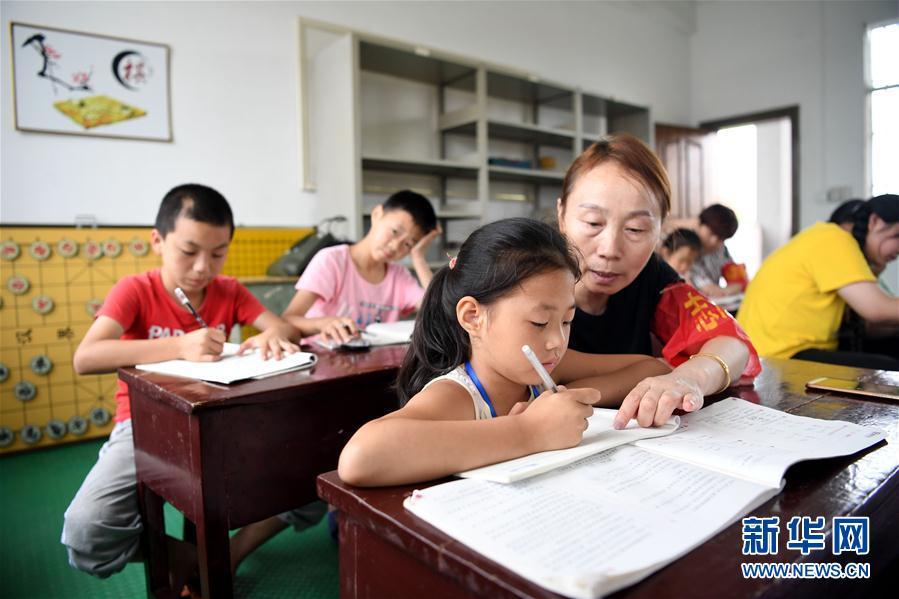 7月16日,在安徽省宿鬆縣洲頭鄉中心小學集中安置點,教師志願者輔導孩子們完成暑假作業。