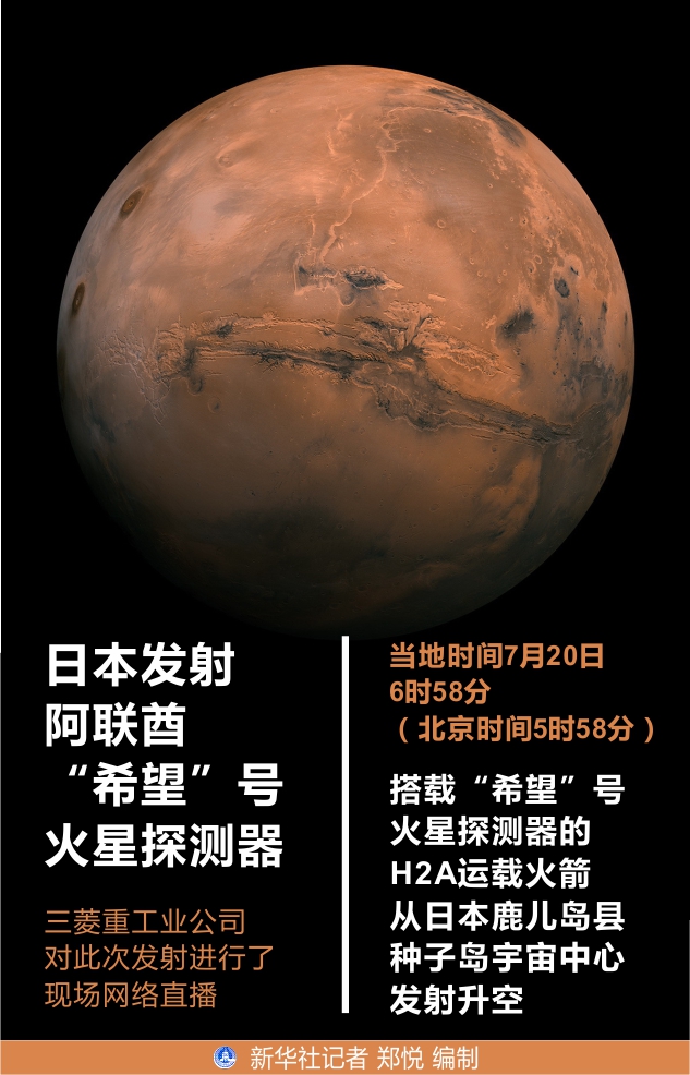 三菱重工業公司對此次發射進行了現場網絡直播。當地時間20日6時58分(北京時間5時58分),一枚H2A運載火箭從日本鹿兒島縣種子島宇宙中心發射升空,成功將“希望”號火星探測器送入太空。探測器在發射后約1小時與火箭分離。