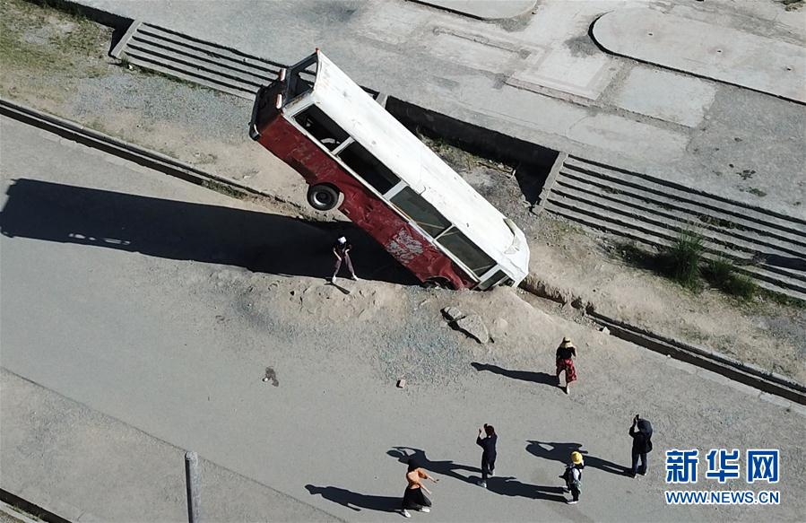2019年8月23日,游客在阿克塞老縣城一處因拍攝電影而設置的景觀前拍照(無人機照片)。