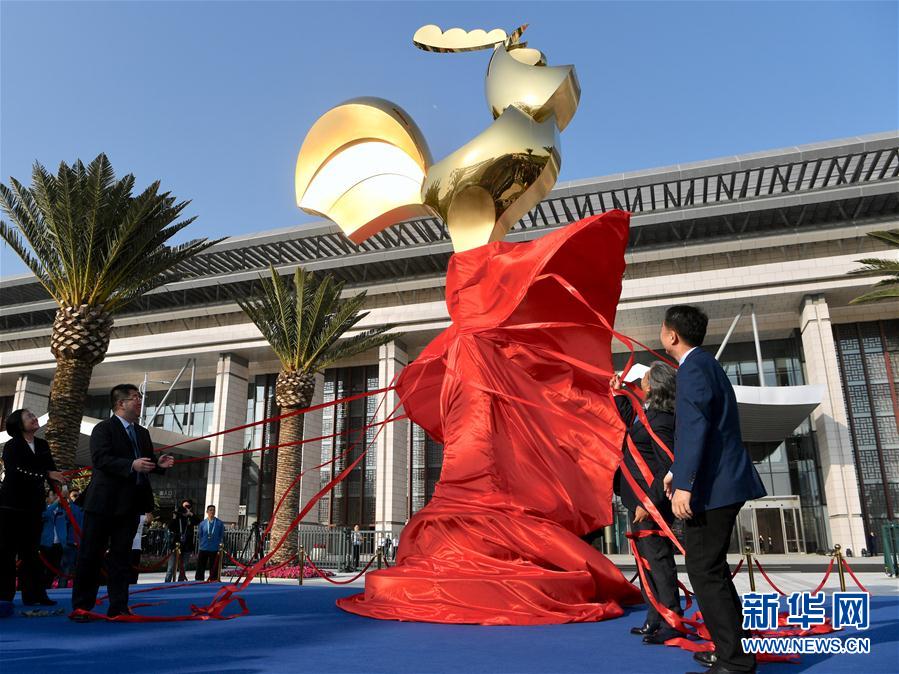 2019年11月19日,嘉賓為第28屆金雞百花電影節金雞雕塑揭幕。當日,第28屆金雞百花電影節金雞雕塑揭幕儀式在廈門海峽大劇院前廣場舉行。 新華社記者 姜克紅 攝