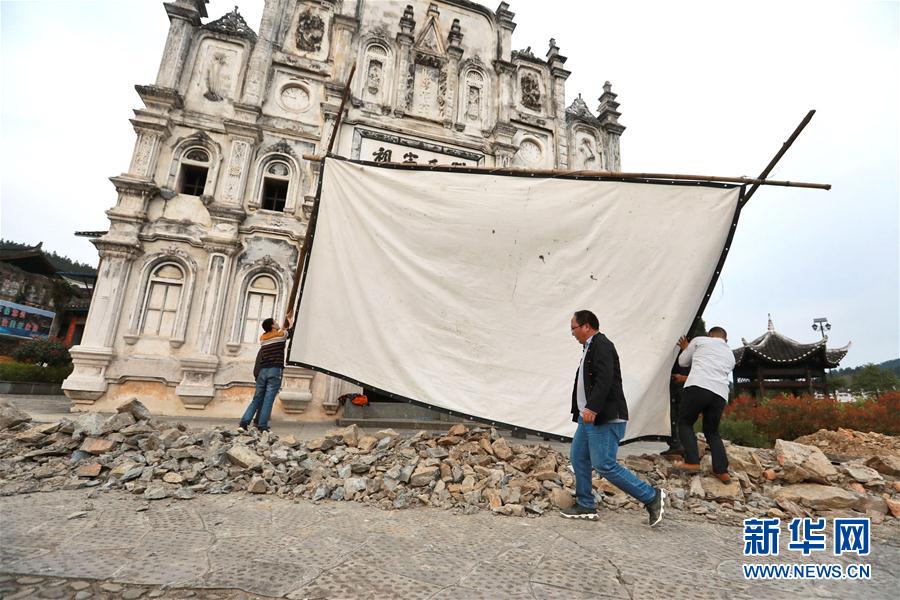 2019年3月19日,在天柱縣坌處鎮三門塘村,黃宜印(中)在搭建電影播放幕布。侗族青年黃宜印是貴州省黔東南苗族侗族自治州天柱縣的一名公益電影放映員。從2014年起,他常年行走在大山裡,為山區群眾播放電影。僅2018年,黃宜印就在天柱縣的37個村寨播放電影444場。 新華社記者 歐東衢 攝