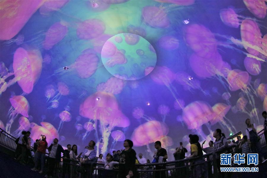 2019年5月19日,游客在山東煙台海昌鯨鯊海洋公園觀看天幕電影。 新華社發(唐克攝)