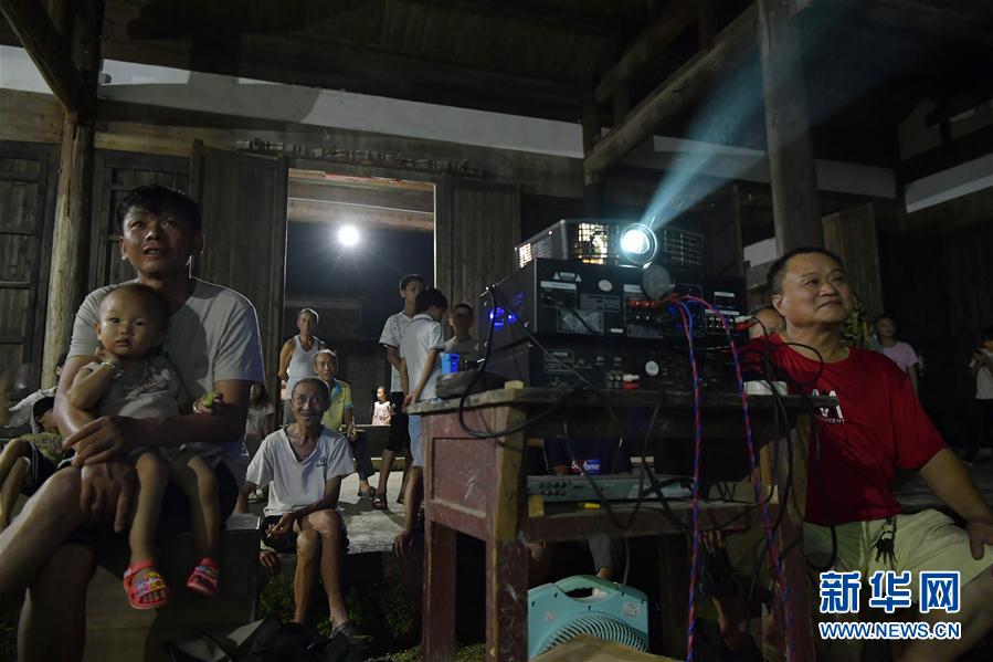 2019年7月2日,在江西省吉安市峽江縣水邊鎮湖洲村,謝萍果(前右)在為村民放電影。