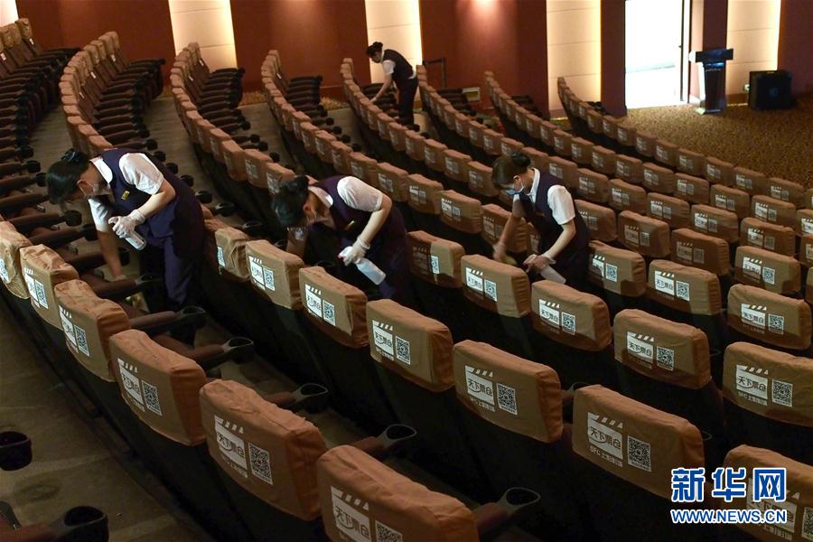 2020年7月19日,上海影城員工在放映廳裡為座位消毒。當日,上海部分電影院為恢復開放營業進行最后階段准備。 新華社記者 任瓏 攝