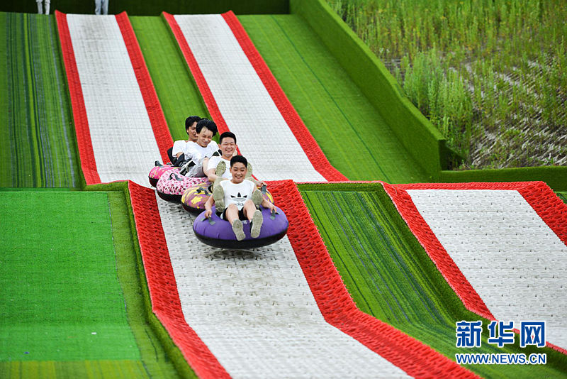 游客在亞布力熊貓館戶外場地體驗“旱地雪圈”運動。新華網發(亞布力熊貓館提供)