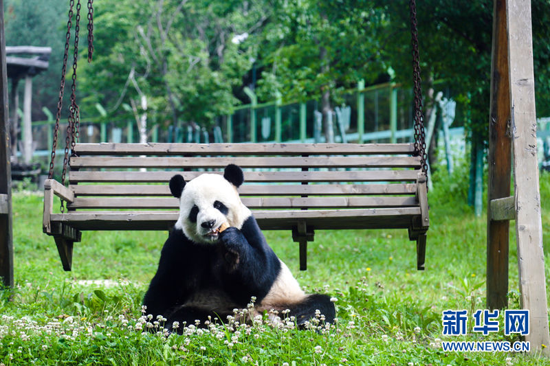 大熊貓思嘉在戶外打秋千。新華網發(亞布力熊貓館提供)
