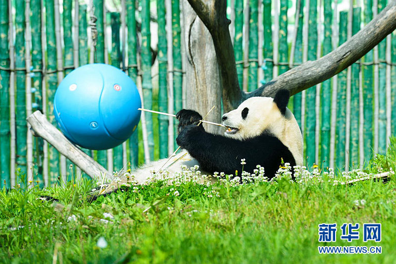 大熊貓思嘉在戶外游戲。新華網發(亞布力熊貓館提供)