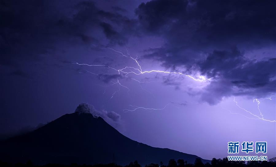這是8月23日在印度尼西亞北蘇門答臘省拍攝的錫納朋火山上空的閃電(長時間曝光照片)。 新華社發(米爾扎攝)