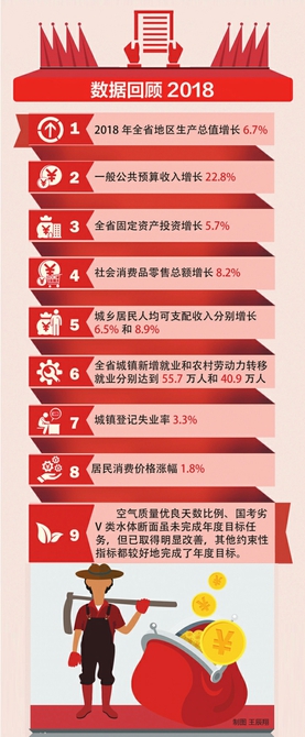 2018年,全省地區生產總值增長6.7%,一般公共預算收入增長22.8%,全省固定資產投資增長5.7%,社會消費品零售總額增長8.2%,城鄉居民人均可支配收入分別增長6.5%和8.9%,全省城鎮新增就業和農村勞動力轉移就業分別達到55.7萬人和40.9萬人,城鎮登記失業率3.3%,居民消費價格漲幅1.8%。其他約束性指標都較好地完成了年度目標。