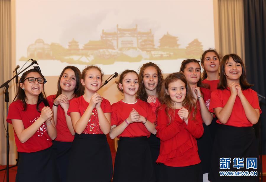 這是2019年2月8日,在意大利拉齊奧的古鎮蒂沃利,蒂沃利國立住讀學校的學生們在中國春節慶祝活動上給大家拜年。 新華社記者 程婷婷 攝