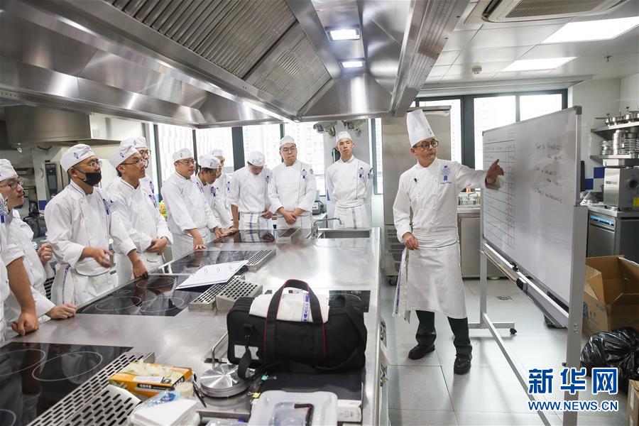 這是2018年10月17日, 來自法國的菲利普(右)在上海藍帶廚藝職業技能培訓學校的教室內給學員們教授法式廚藝。 新華社記者 丁汀 攝