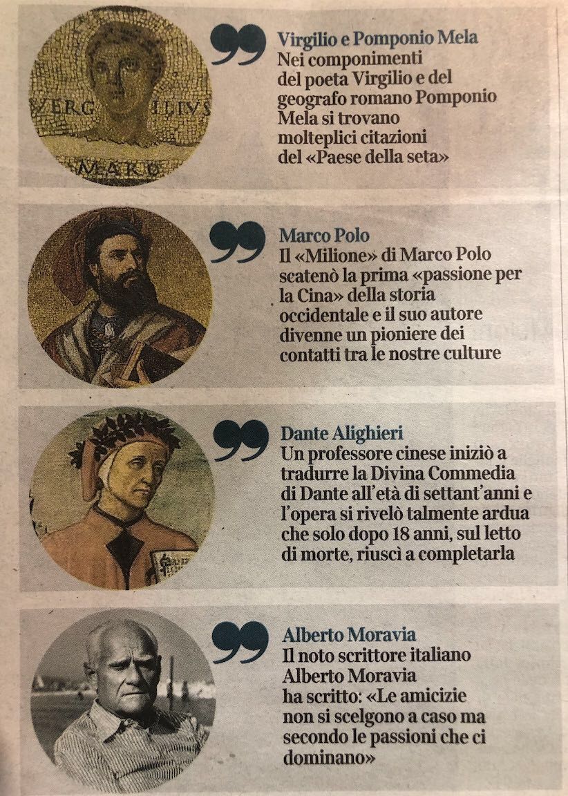△《晚郵報》特意刊出了習主席署名文章中提到的幾位意大利名人的圖片。自上而下分別是:生活在約兩千年前的古羅馬地理學家龐波尼烏斯·梅拉,威尼斯探險家馬可·波羅,意大利中世紀詩人但丁和20世紀意大利小說家阿爾貝托·莫拉維亞。(央視記者張穎拍攝)