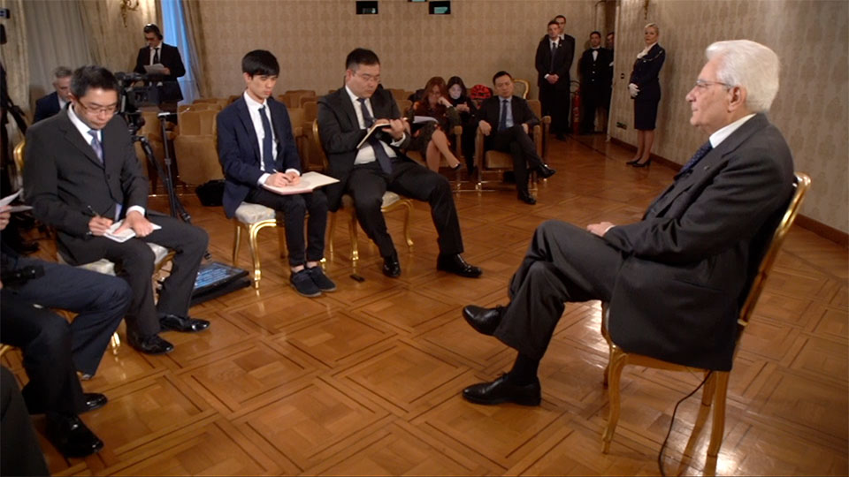 △3月19日,意大利總統馬塔雷拉接受中央廣播電視總台等中國媒體的聯合採訪。(央視記者李耀洋提供)