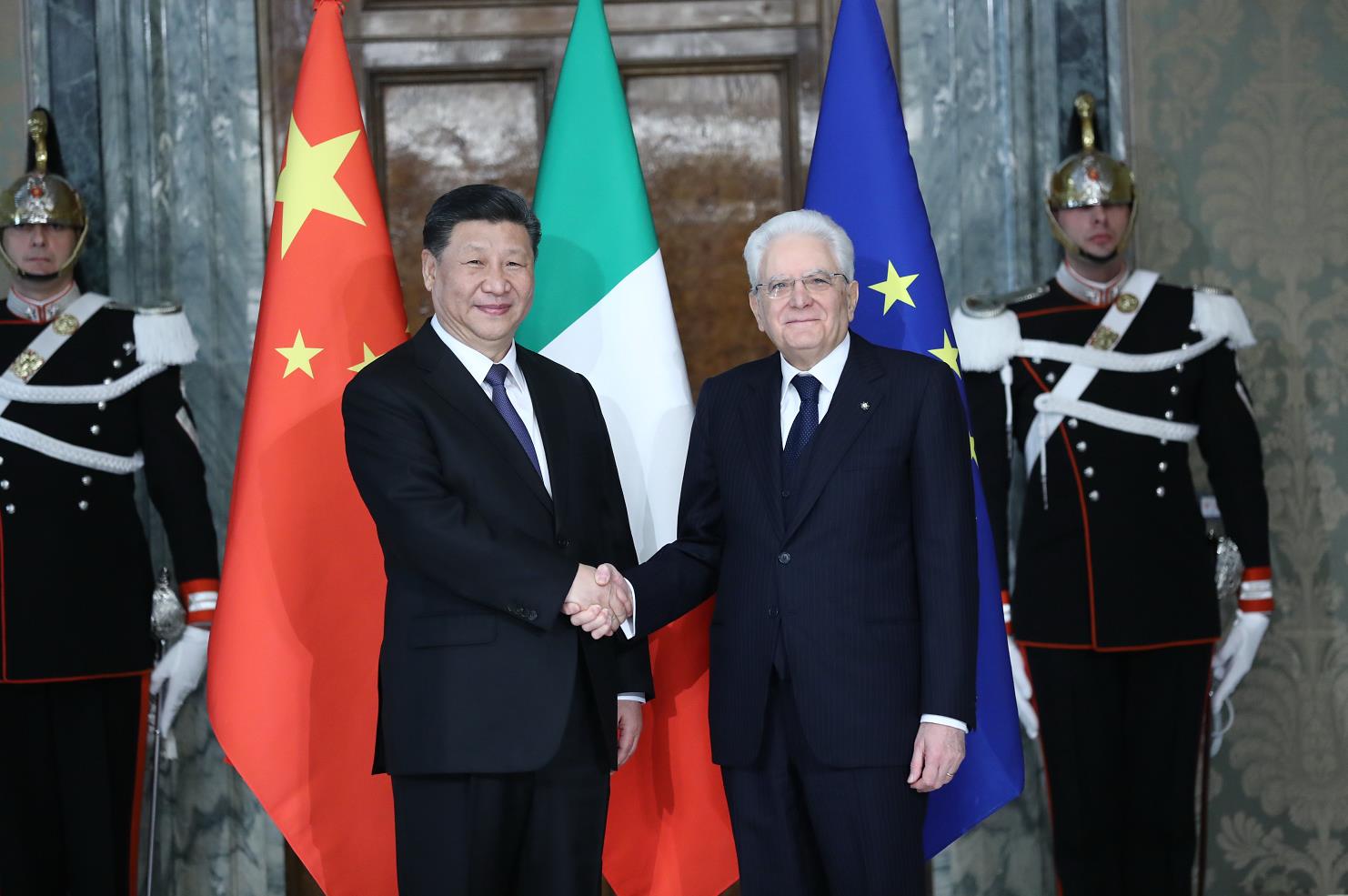 習近平和夫人彭麗媛抵達時,馬塔雷拉總統和女兒勞拉在停車處迎接,互致問候。隨后,軍樂團奏中國、意大利兩國國歌,升中國國旗。
