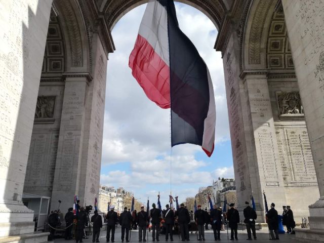 3月25日,巴黎碧空如洗,一面巨大法國國旗飄揚在凱旋門前。新華社記者 蘭紅光 攝
