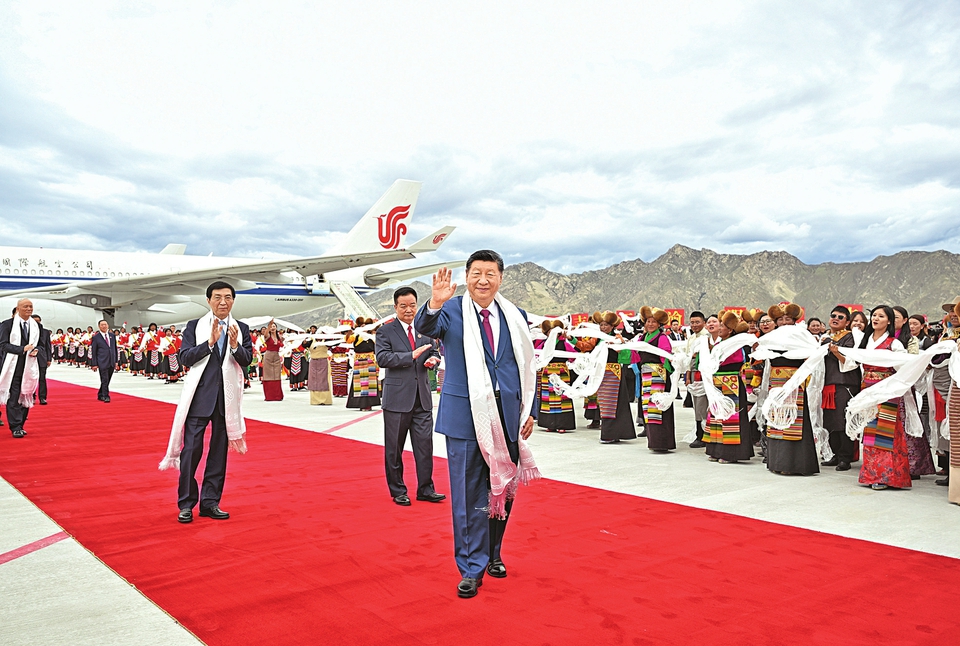 充滿節日氛圍的古城拉薩,從機場到住地主要街道兩旁彩旗舞動,各族群眾手持紅旗、捧著哈達,齊聲歡呼,表達歡迎和感激之情。習近平打開車窗,向沿途群眾頻頻揮手致意。