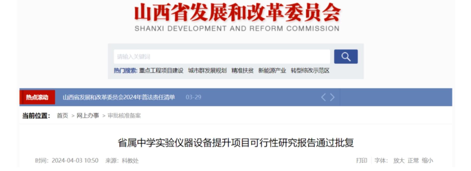 近日,省发改委以晋发改审批函〔2024〕93号批复了省属中学实验仪器设备提升项目可行性研究报告。主要内容如下: