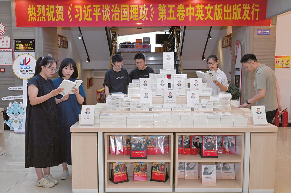当天上午,记者在山西图书大厦建南店看到,《习近平谈治国理政》第五卷整齐有序地摆放在展台上,现场不少读者正翻阅这本新书。富力城社区干部刘静表示,之前已经认真学习了《习近平谈治国理政》前四卷,第五卷刚一上市,就立刻前来购买阅读。