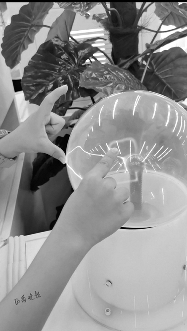 一颗晶莹剔透的玻璃球里有一个蓝色光柱,球内游动着细碎的银色电弧。一年级的郭梓豪好奇地把小手指刚贴上球面,球内蛰伏的闪电像被惊醒的银蛇,瞬间抵达他指尖按压的位置,周围顿时响起一片“哇”的惊叹。