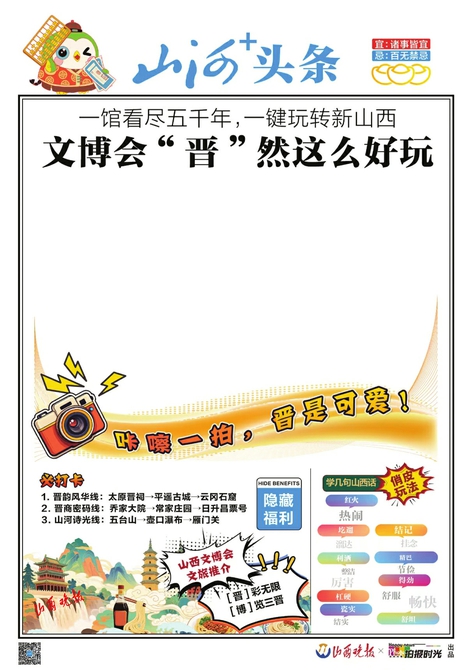 其中,“颜值新星亮相文博会”版本自带电视背景,晋侯鸟尊、云冈大佛、平遥古城等文化IP组团“出镜”,让你与国宝同框,气场拉满。“文博会‘晋’然这么好玩”版本亮出3条必打卡路线,“拍一张”就知道去哪嗨。想更俏皮?专版还教说山西话,“待见”“得劲”张口来,让你秒变地道山西通。