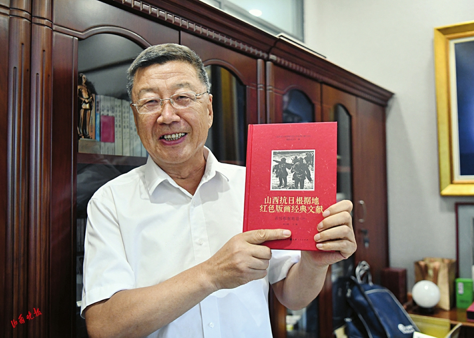 一幅“火烧阳明堡机场”的黑白版画,配一篇文字报道《代县四区阳明堡的抗战工作》(原载于1938年6月10日《抗敌报》第三版),图文并茂,生动记录了山西抗日根据地军民抗战的场景……张汉静翻开一册《山西抗日根据地红色版画经典文献》中的一页,抗战烽火扑面而来。在他身后的书柜里,整齐摆放着《山西抗日根据地红色版画经典文献》,其中《文献》14册,《研究》3册。像“火烧阳明堡机场”这样的红色版画,《文献》共收录了1600余幅。