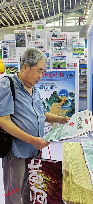 78岁的张树清认真翻阅山西晚报文博会特刊。