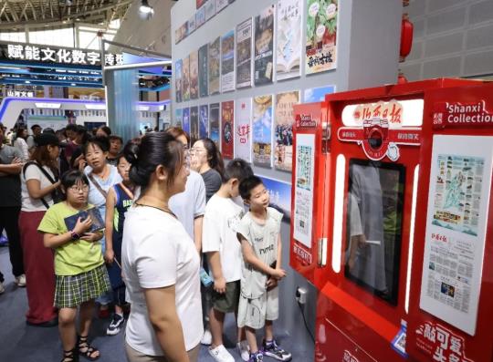 如果说数字记者是“对话未来”,那么不远处的拍报机体验区,则让每个人都能成为“头版主角”,亲手定制一份属于自己的历史瞬间。12时,参观者李女士正带着儿子豆豆站在交互屏前,指尖轻点,短短30秒,一份排版精美、意义非凡的“山西日报纪念头版”便从终端输出。版面上赫然印着“第七届山西文化产业博览交易会隆重开幕”,下面则是母子俩笑容灿烂的照片。“太好玩了!回家一定让小伙伴们都看看,我‘上报纸’啦!”捧着纪念报的豆豆抑制不住地兴奋。