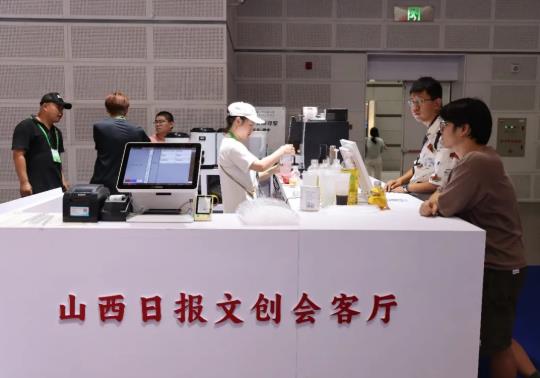 这边带着墨香的头版“报纸”刚刚出炉,旁边的文创饮品区飘来的阵阵茶香与果香就吸引了小朋友的注意,这里俨然已经成为展厅的“社交会客厅”,以《山西日报》品牌文化为内核,创意推出的系列主题特调茶饮,每一杯都是一份“可品尝的文化符号”。