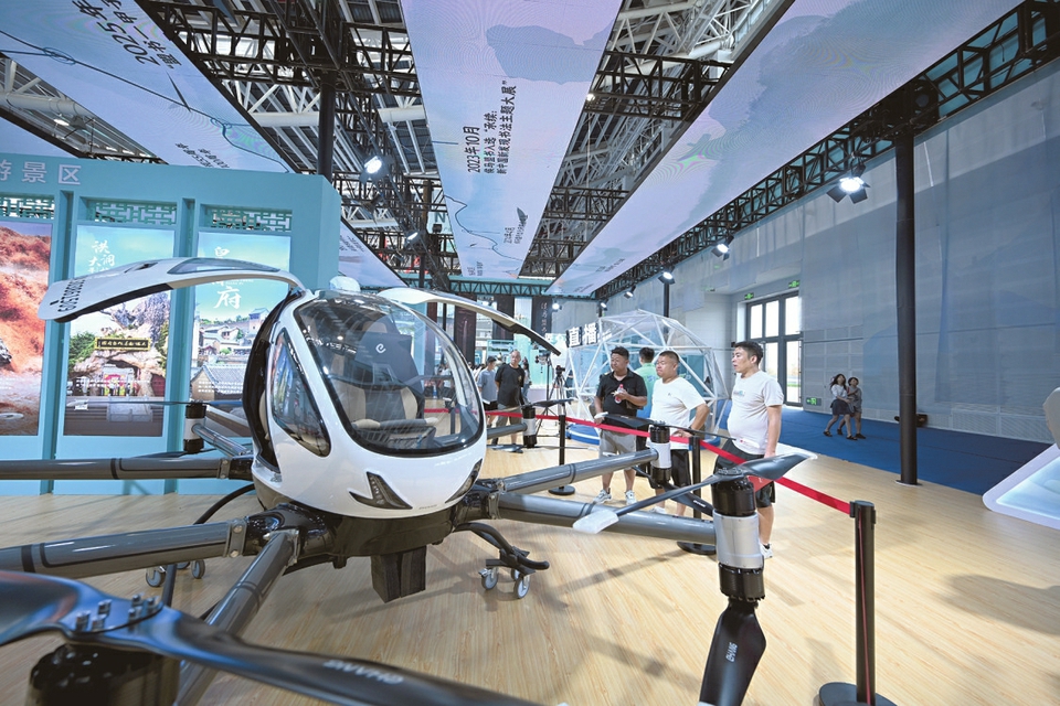 文博会期间,省文化和旅游厅展区内,大型无人驾驶载人航空器引人驻足。