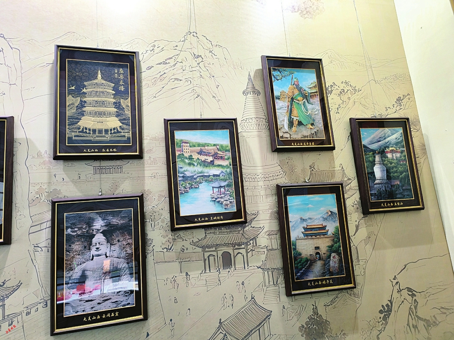 展示墙上挂着大美山西系列的金(银)版画,以山西省11个市的标志性自然风光与人文景观为创作蓝本,匠心独运地采用高品质贵金属为载体,结合了尖端精雕与多层彩绘工艺打造而成。