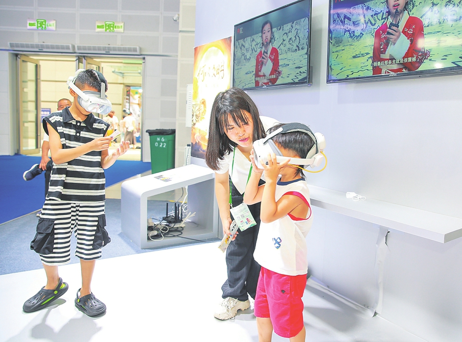 图为展区工作人员带领孩子体验VR时空之旅。本报记者王昕摄