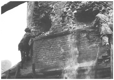 百团大战相关历史图片。图为八路军战士在爆破新矿大烟囱。百团大战纪念馆供图