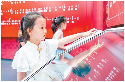 孩子们在百团大战纪念馆展厅内体验数字设备。卢鹏宇摄