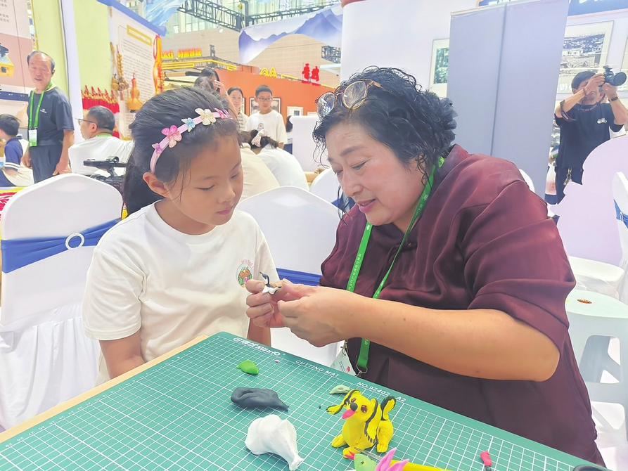在文博会吕梁展馆岚县面塑展区,国家级非遗传承人袁建华正在教授小朋友面塑制作手法。本报记者李京益摄