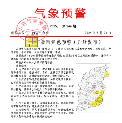 山西省气象台2025年08月21日15时09分升级发布暴雨黄色预警。 预警区域 大同东部、晋中东部、 长治北部和东部、晋城 预计未来12小时预警区域将有最大雨强40毫米/小时以上的短时强降水,并伴有7级或以上的雷暴大风和冰雹等强对流天气。