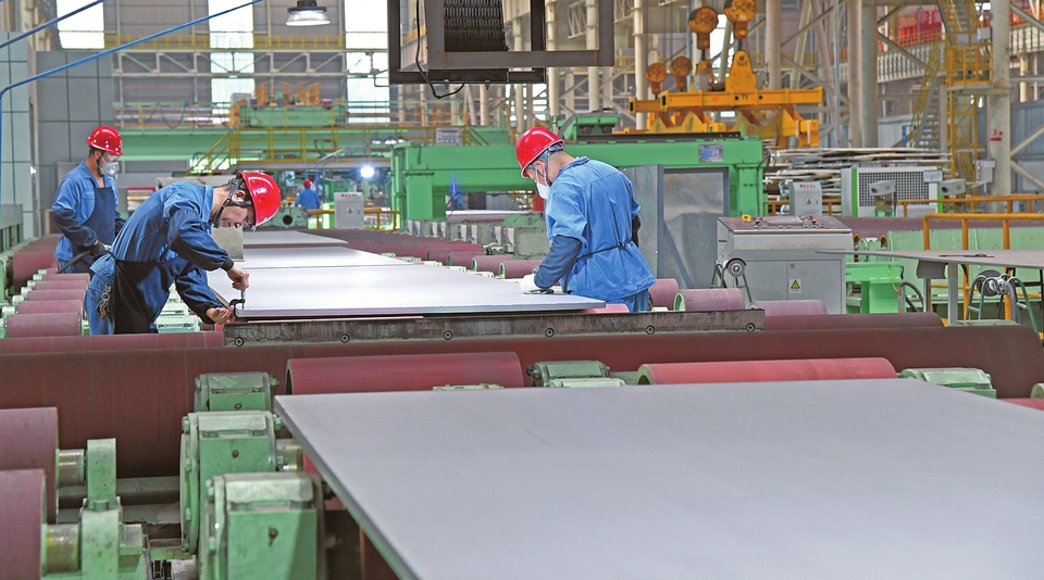 7月16日,中国宝武太钢集团不锈热轧厂各班组围绕各自竞赛关键指标展开比拼。图为职工在“提质增效劳动竞赛”中巡检产品质量。