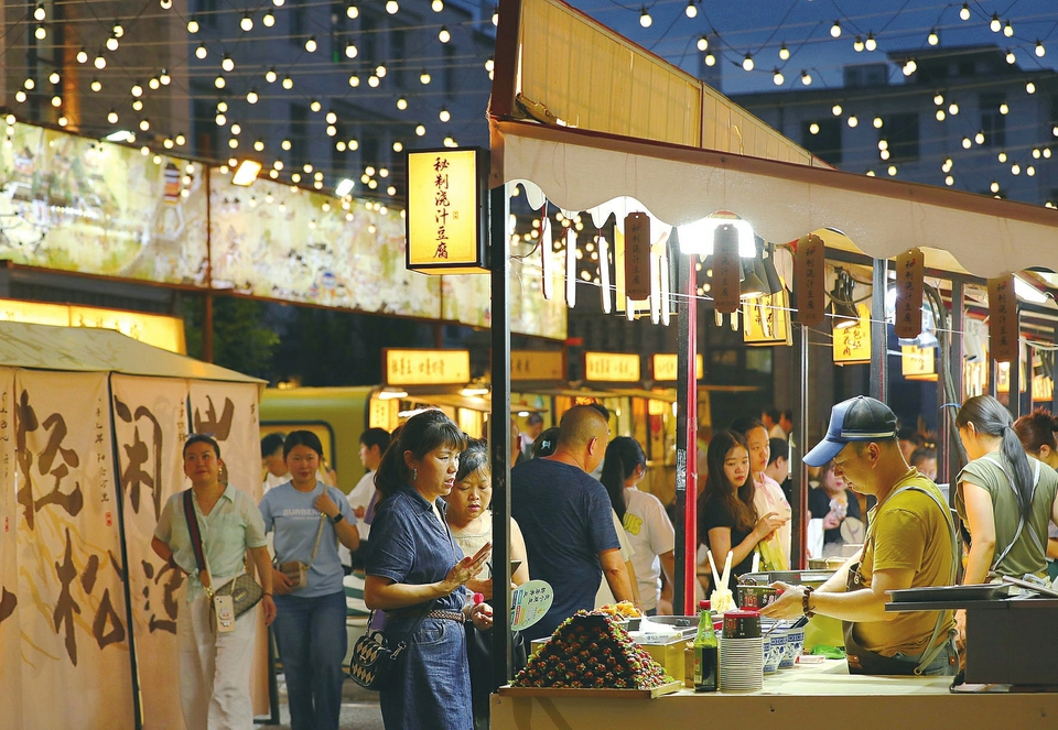 8月3日,省城钟楼街夜市华灯初上,游客在璀璨夜色中购物、赏夜景、品美食,感受夏日夜经济活力。