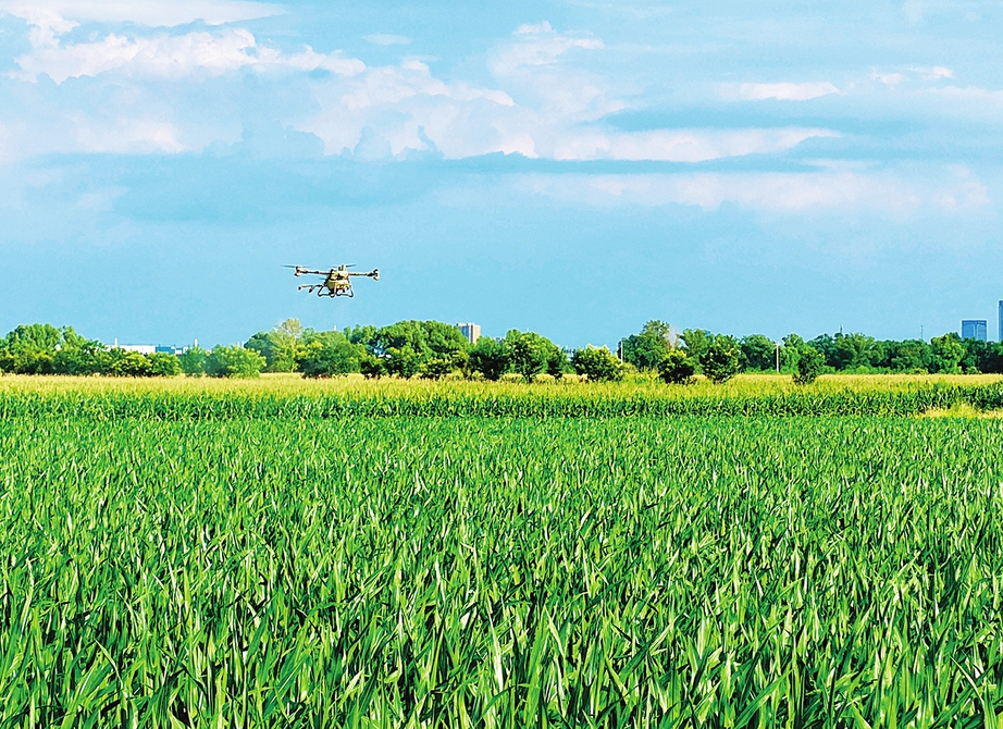 8月11日,省城小店区刘家堡乡西草寨村500亩玉米地上空,无人机正在进行施肥作业,助力作物茁壮成长。
