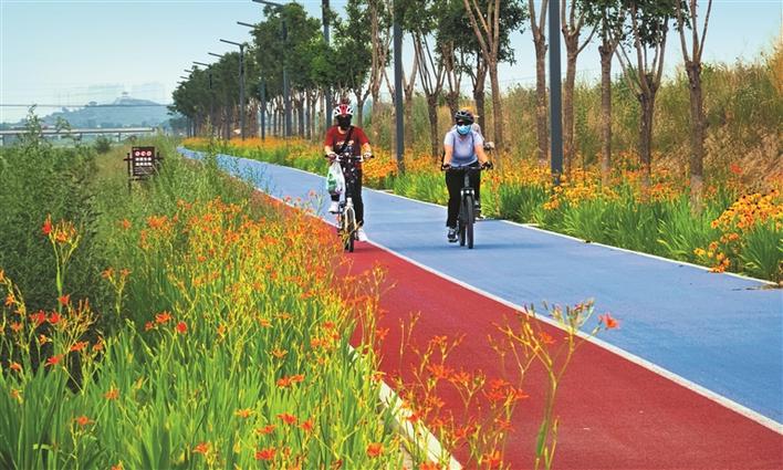 7月9日,市民在忻州云中河景区自行车专用道骑行,享受低碳绿色健康运动带来的轻松愉悦。