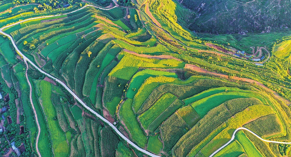 8月22日,夏县南大里乡,梯田秋禾、蜿蜒道路、山村民居、沟壑树木等相互映衬,构成一幅生机盎然的绿色生态画卷。