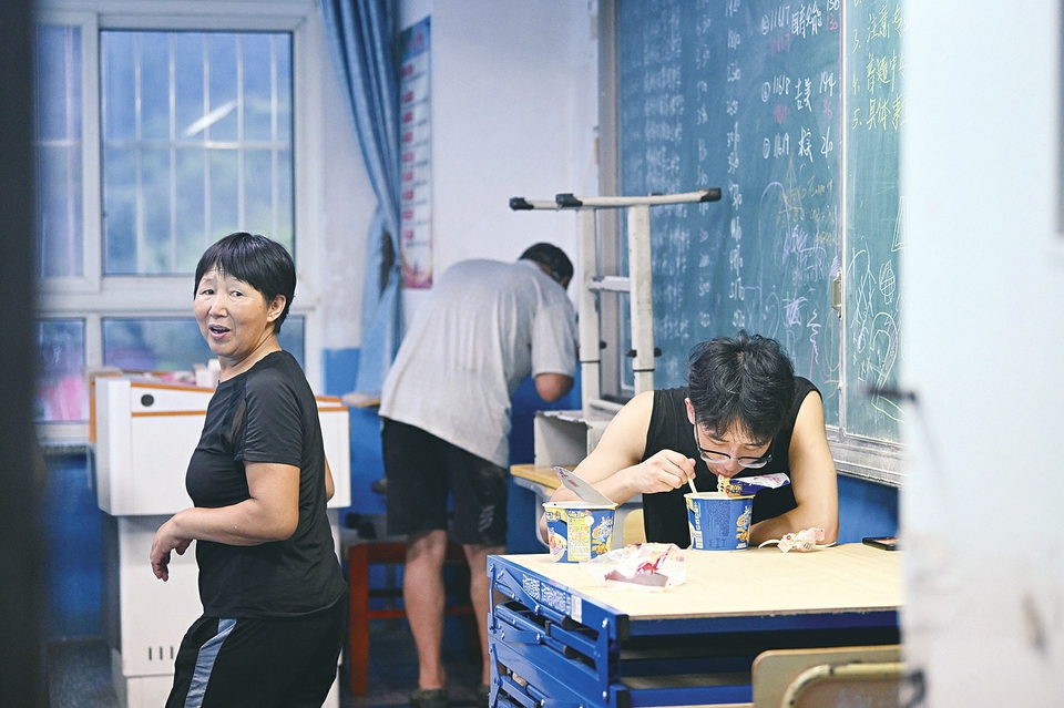 7月28日,集中安置群众在天津市蓟州区下营镇初级中学吃泡面。