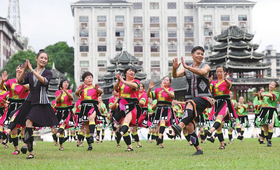 ①市民在湖南省怀化市通道侗族自治县民族广场参加健身活动。
