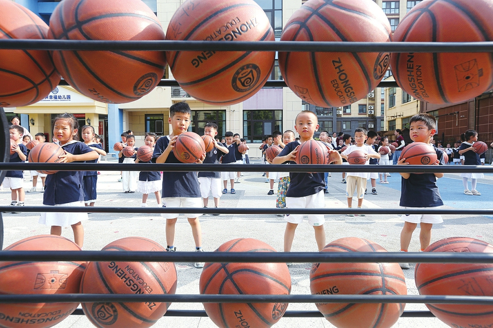 ④在江苏省连云港市钟声幸福幼儿园,小朋友练习花式篮球。
