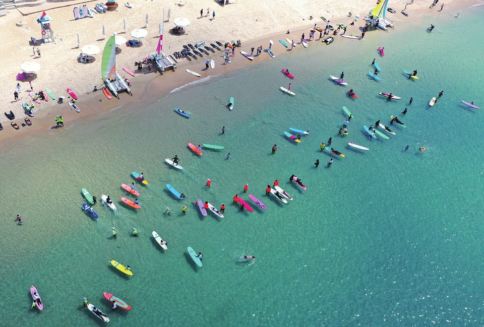 8月10日,游客在三亚市后海村附近海域冲浪嬉水(无人机照片)。暑期,许多游客来到海南三亚,学习体验冲浪,感受与海共舞的乐趣。