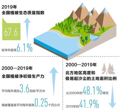 2000—2019年全国有93%的区域年平均气温呈升高趋势,有80.6%的区域年降水量呈增加趋势,良好的水热条件有利于植被生长;加之各地加大了生态系统保护和修复力度,有力地促进了植被生态质量向好发展。2019年虽受干旱、暴雨、台风等气象灾害的影响,全国植被生态质量指数为2000年以来第四高,但仍处于较高水平,全国有92%的区域从2000年以来变得“越来越绿”。其中,2000—2019年,全国植被净初级生产力平均每年增加3.6克碳/平方米,植被覆盖度平均每年提高0.25个百分点。